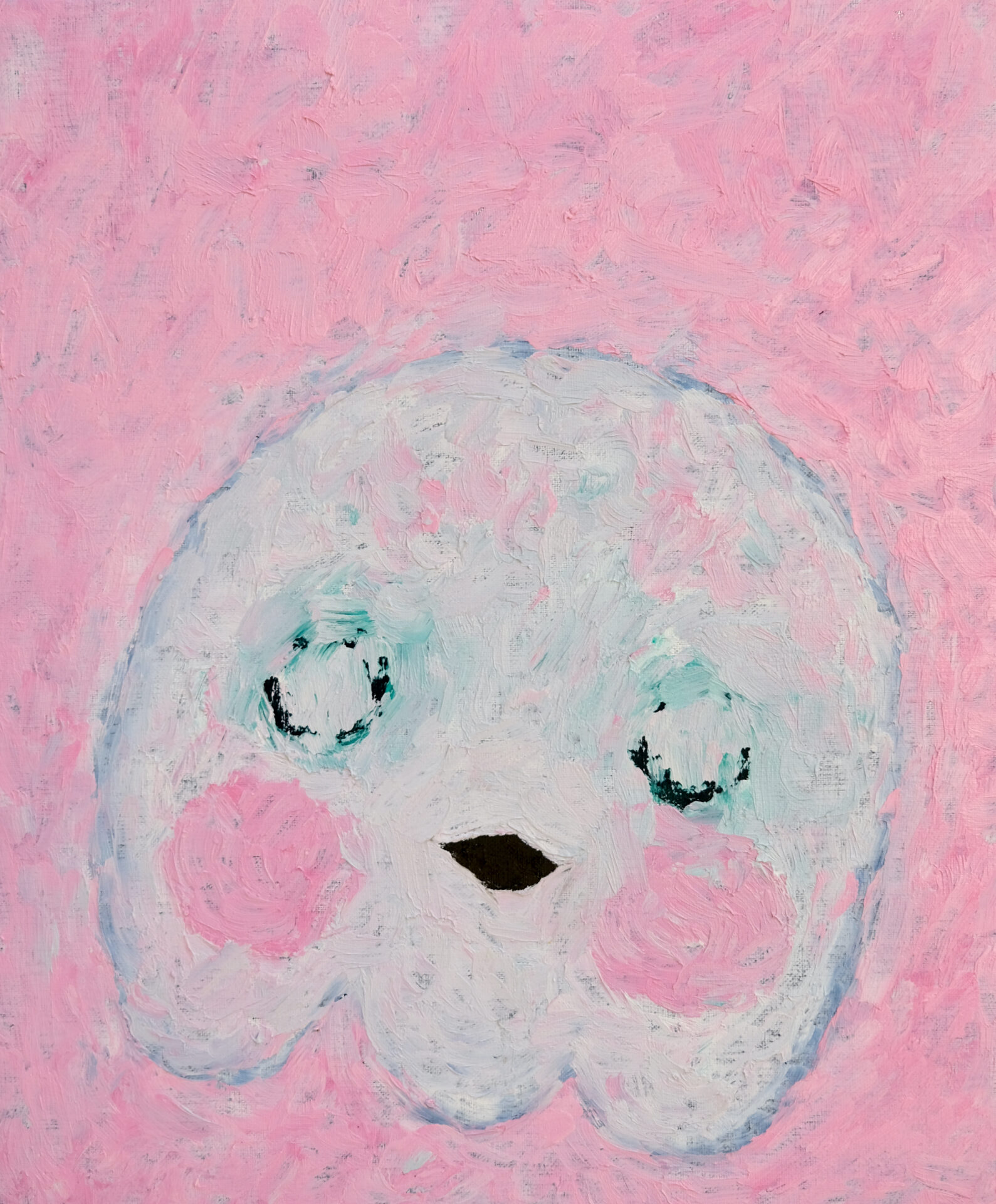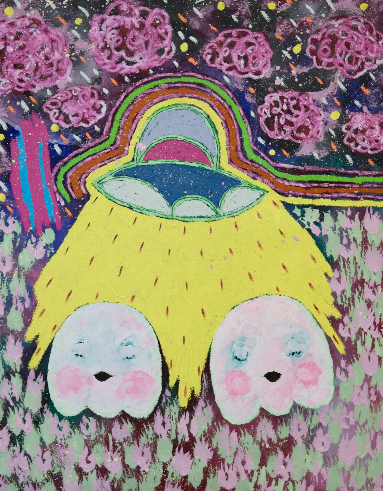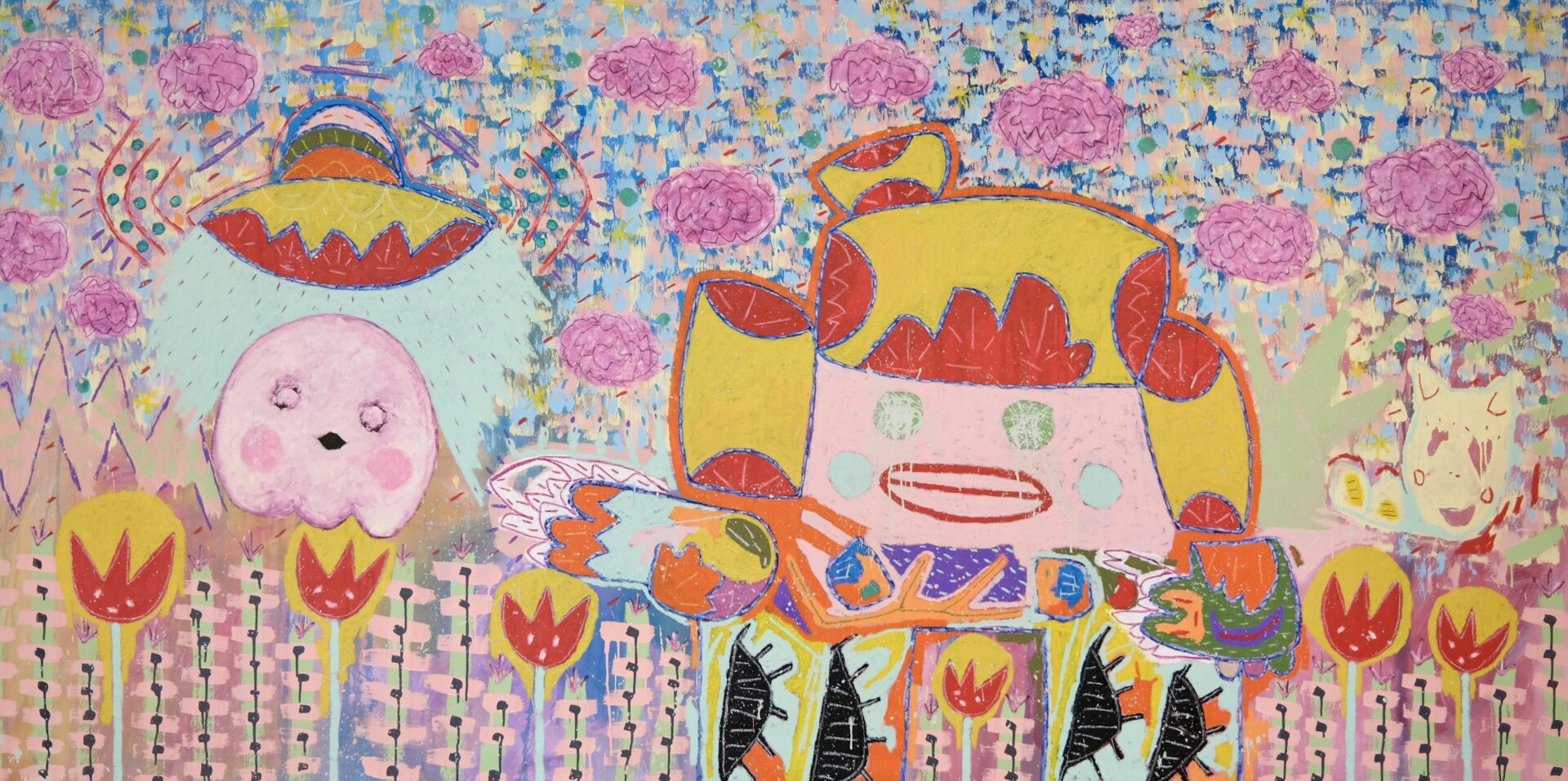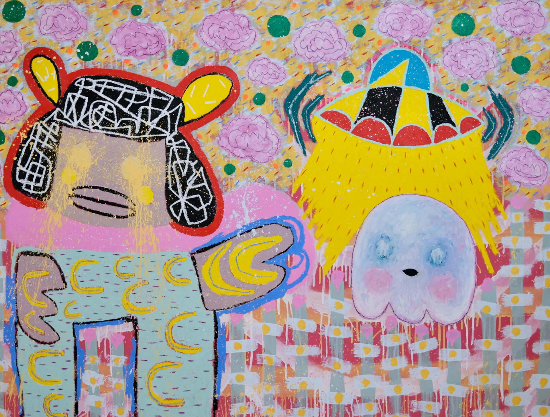 "His characters are reduced to puristic shapes and textures reminiscent of uninhibited adolescence. However, echoing a similar sophistication to Willem de Kooning’s figures, Handler competently and intriguingly allows figure and background to integrate at moments. This compositional choice is particularly inspiring for introspection. His technical expression in stroke resonates in his color palette. He skillfully builds a pointedly dynamic atmosphere within the canvas utilizing an impressive range of hues. Some pieces focus in rich, deep colors and others whose find resonance in pastels to further internal conversation."